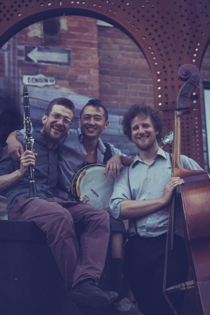 John David Williams on Clarinet, Chris Adriaanse on bass, and Benson Lee on Banjo, have been performing together for near a decade. The trio of musicians long steeped in various facets of Ontario’s traditional jazz scenes first got together to make music in the vein of the trio recordings of the great New Orleans clarinettist George Lewis.